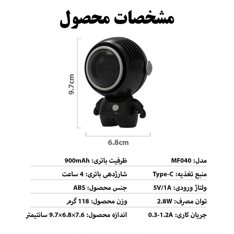 در روزهای گرمای تابستان یکی از ضروری ترین وسایلی که میتوانید همراه خود داشته باشید، پنکههای همراه هستند. این پنکهها با خنک کردن شما در روزهای گرم تابستان به یک همراه همیشگی شما در هنگام خرید، روزهای کاری و سفر تبدیل خواهند شد. پنکه شارژی مدل MF040 با طرح فضانورد خود یک محصول خاص و با زیبایی منحصر به فرد است. این محصول با داشتن موتوری از نوع Brushless علاوه بر ارائه دادن سرعت، گشتاور و بهرهوری بالاتر، مصرف انرژی کمتری دارد و از این طریق شارژدهی و طول عمر باتری را افزایش میدهد. باتری محصول دارای ظرفیت 900 میلی آمپر است که قابلیت شارژدهی تا 5 ساعت را دارد. این پنکه دارای سه حالت مختلف سرعت باد است که با هر بار فشردن دکمه، سرعت باد افزایش مییابد. پنکه G01 قابل استفاده در حالتهای مختلف است و میتوان آن را به صورت دستی، رومیزی و آویز گردنی استفاده کرد. درگاه شارژ محصول از نوع Type-C است و با سرعت خوبی شارژ می شود. خروجی باد در این محصول قابلیت چرخش 360 درجه دارد و امکان تنظیم جهت وزش باد در زاویه دلخواه را فراهم میآورد. بند آویز گردنی محصول نیز از جنس سیلیکون است و قابلیت تنظیم اندازه در 3 حالت را دارد و برای تمامی سنین مناسب است.